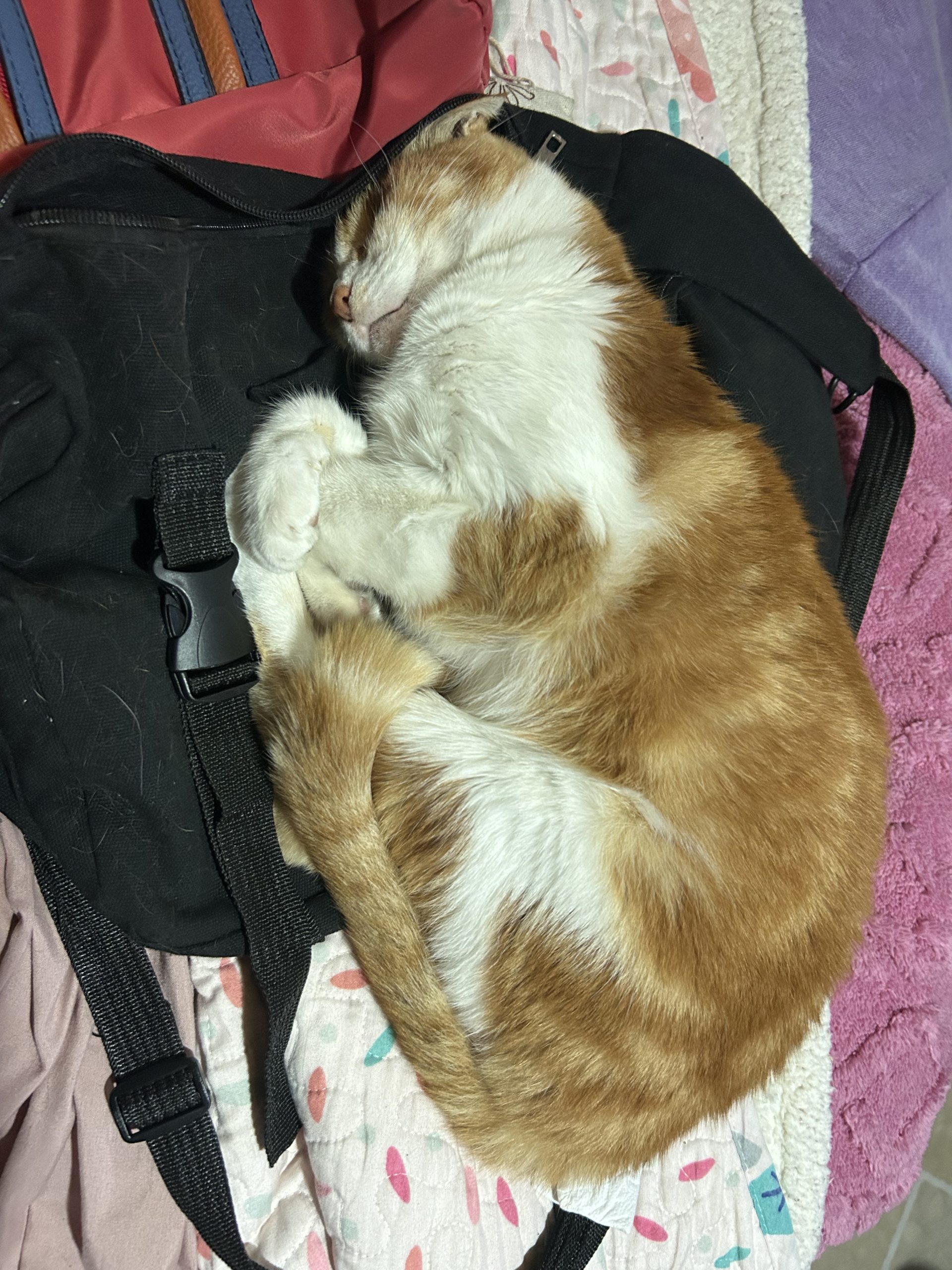 Un descanso merecido en lo que claramente es su nuevo lugar favorito: la mochila de alguien que ya perdió el derecho a usarla. Ronroneos incluidos.